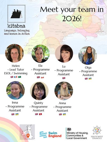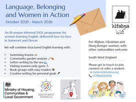 This builds on work Kitabna founder Helen Patuck began with an artistic grant she received in March 2025 from Arts Council England, sharing creative practice with several organisations, including South West Councils. "Language, Belonging and Women in Action" will combine structured English learning with practical or creative activities, co-facilitated by a lead tutor and language/activities assistants primarily recruited from the target community of Afghan, Ukrainian and Hong Konger communities.